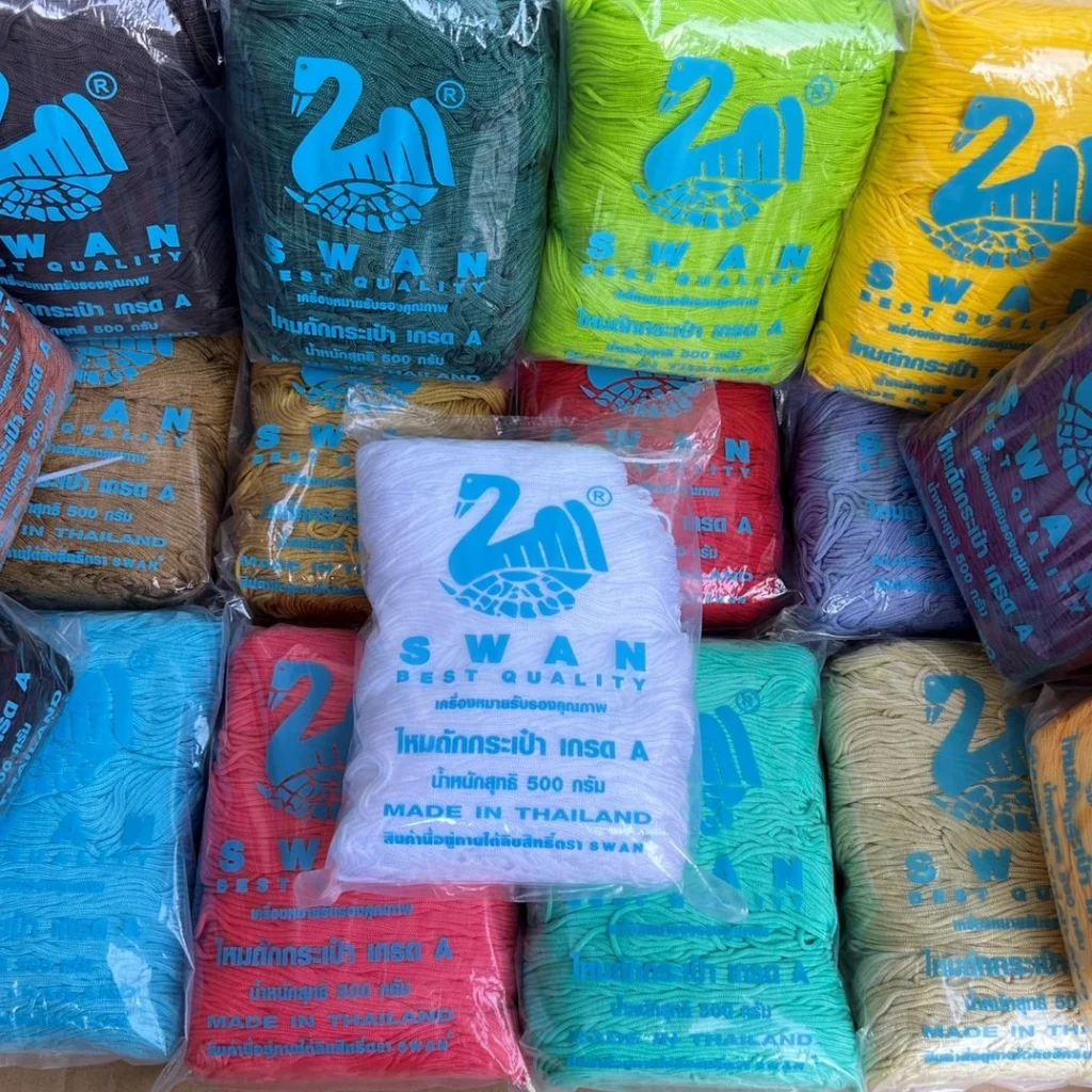 ไหมสำหรับถักกระเป๋า ถักหมวก หรือใช้เป็นเชือก DIY ต่างเช่นเครื่องประดับ สินค้าคุณภาพตราหงส์ ขนาด ๒ มิลลิเมตร น้ำหนัก 500 กรัมต่อแพ็ค สีสวย สด ไม่ตก เส้นนิ่มถักง่าย มีทั้งแบบสีพื้น ดิ้นเงิน และดิ้นทอง มีสีให้เลือกมากมายกว่า 40 สี