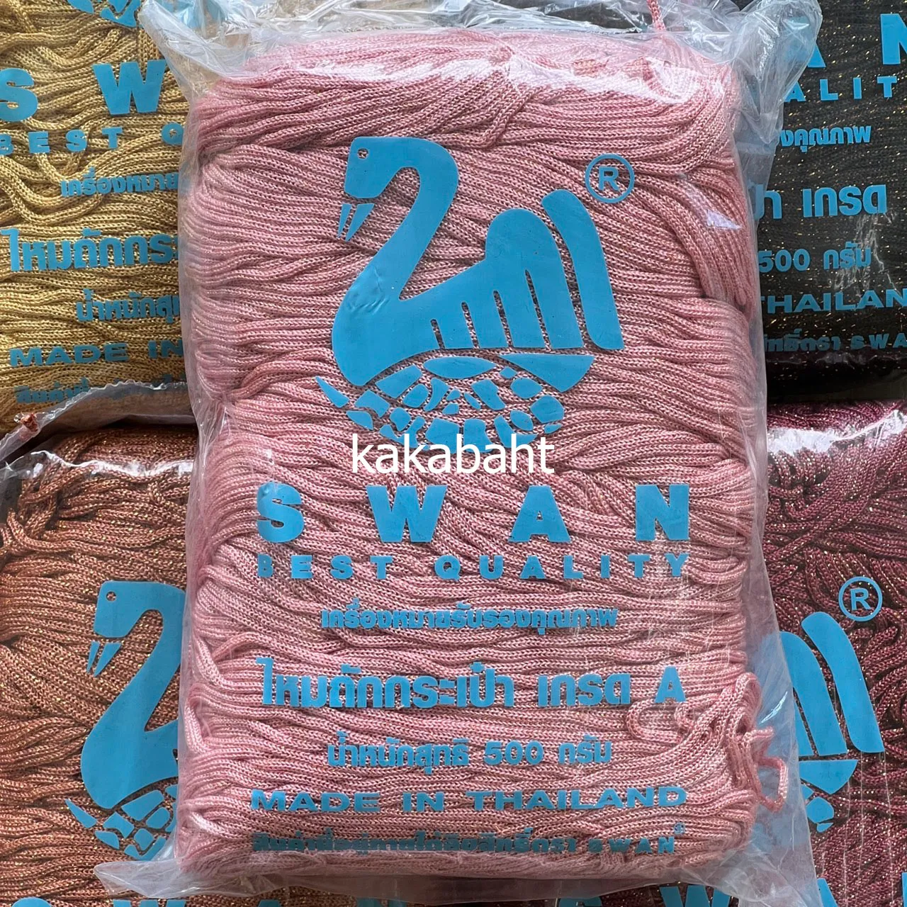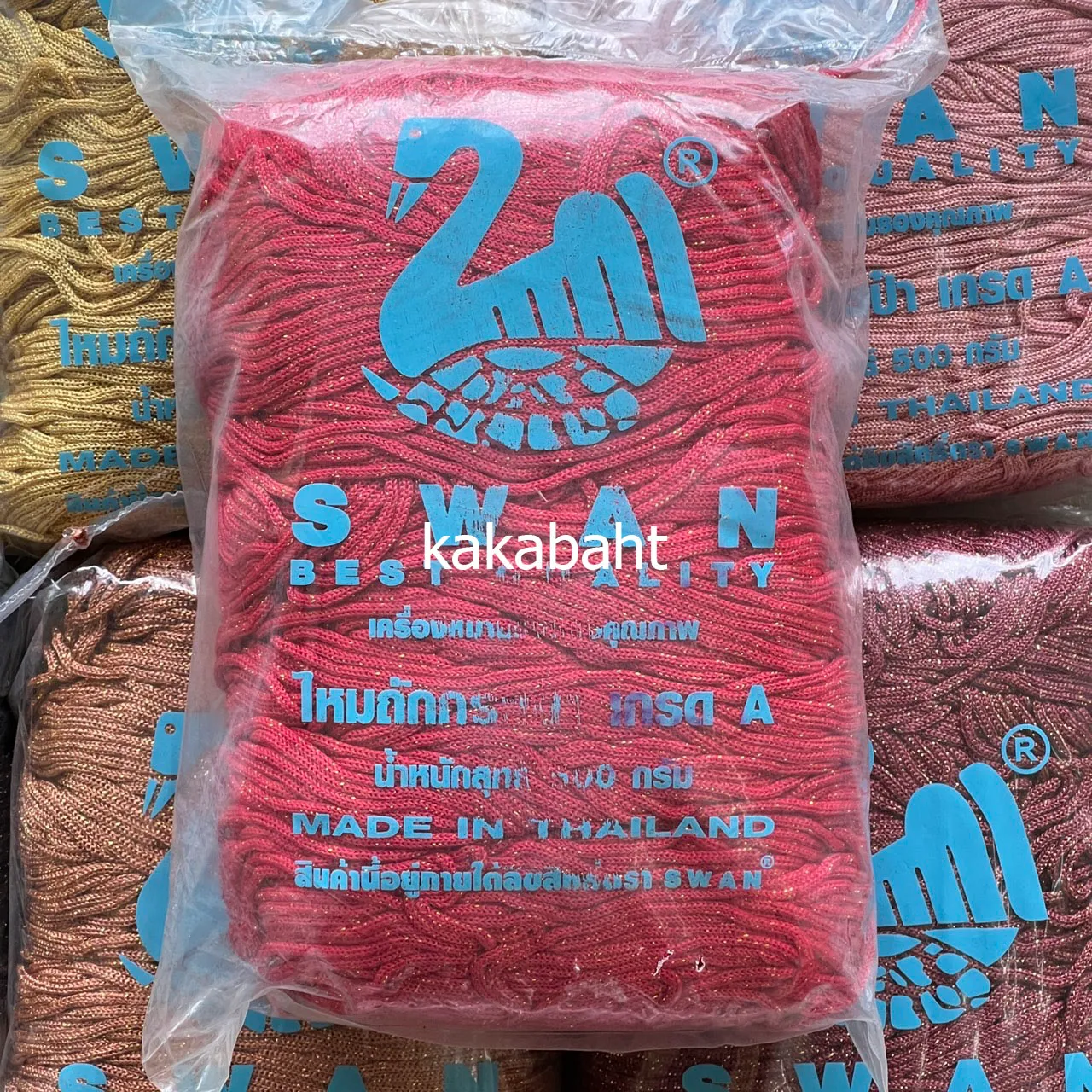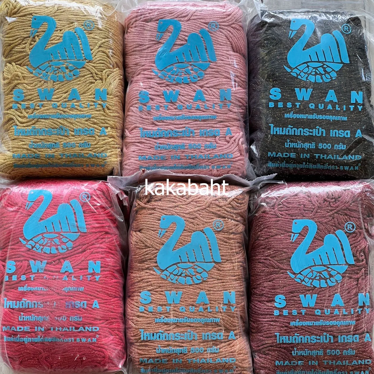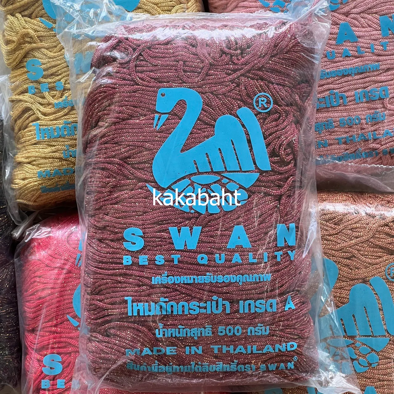 ไหมถักกระเป๋า หรือเชือกร่มถักตราหงส์ แบบดิ้นทอง/เหลือบทอง เส้นไหมผสมเกร็ดทอง ทำให้สีไหมมีความแวววาวสะดุดตาเพิ่มความสวยงามให้กับกระเป๋าหรือหมวกที่ถัก น้ำหนัก 500 กรัม เส้นผ่านศูยน์กลาง 2 มิลลิเมตร สีสวยสด