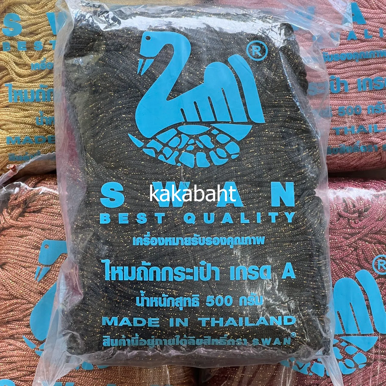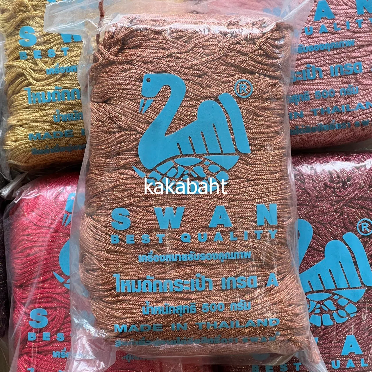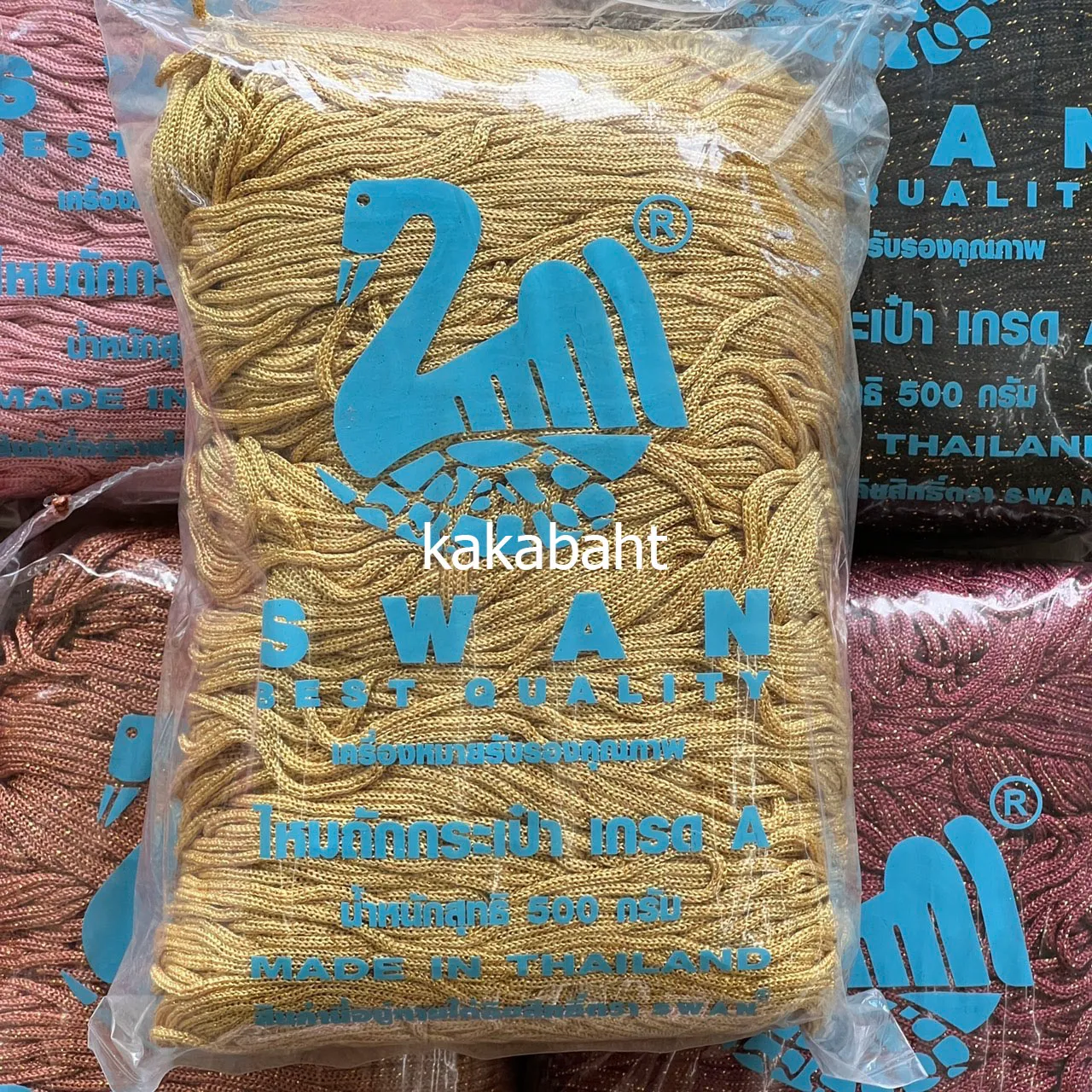 ไหมถักกระเป๋า หรือเชือกร่มถักตราหงส์ แบบดิ้นทอง/เหลือบทอง เส้นไหมผสมเกร็ดทอง ทำให้สีไหมมีความแวววาวสะดุดตาเพิ่มความสวยงามให้กับกระเป๋าหรือหมวกที่ถัก