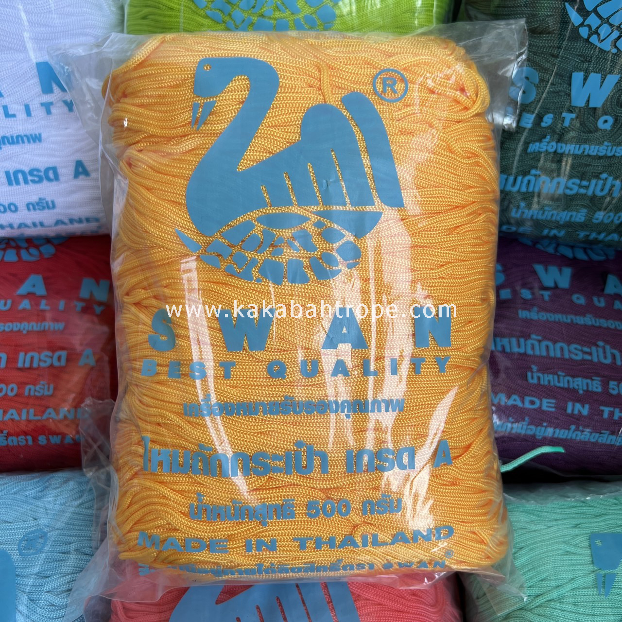 เชือกร่มถักกระเป่า ไหมถักโครเชต์ ไหมถักกระเป๋าเกรด A ตราหงส์ (SWAN) สีเหลืองทอง เป็นสีพื้น ไหมญี่ปุ่นคุณภาพสูง เส้นนิ่มถักง่าย ถักเร็ว สีสวยทน สดไม่ตก มีสีให้เลือกมากมาย ทำจากเส้นใยสั่งเคราะห์ สามารถนำไปใช้ถักกระเป่า ถักเสื้อ ใช้เป็นเชือก DIY ใช้เป็นเชือกเอนกประสงค์ สามารถนำไปใช้ทำสร้อยคอ หรือเครื่องประดับต่าง