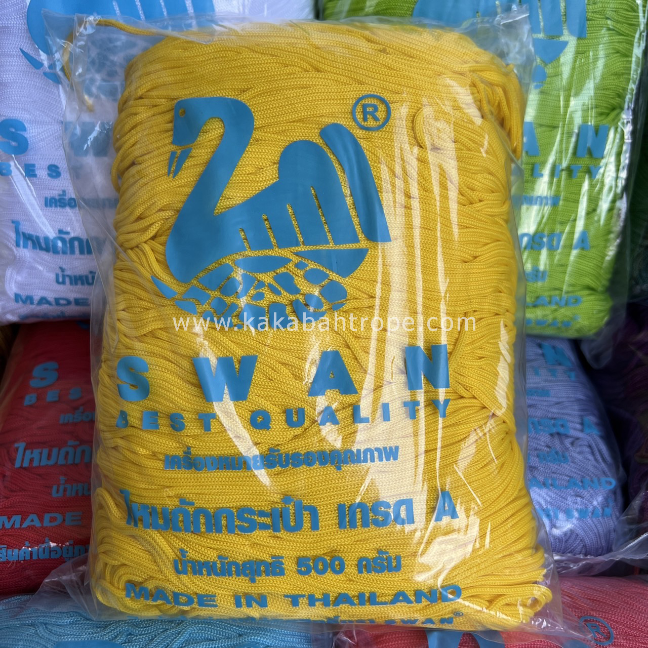 เชือกร่มถักกระเป่า ไหมถักโครเชต์ ไหมถักกระเป๋าเกรด A ตราหงส์ (SWAN) สีเหลืองสด เป็นสีพื้น ไหมญี่ปุ่นคุณภาพสูง เส้นนิ่มถักง่าย ถักเร็ว สีสวยทน สดไม่ตก มีสีให้เลือกมากมาย ทำจากเส้นใยสั่งเคราะห์ สามารถนำไปใช้ถักกระเป่า ถักเสื้อ ใช้เป็นเชือก DIY ใช้เป็นเชือกเอนกประสงค์ สามารถนำไปใช้ทำสร้อยคอ หรือเครื่องประดับต่าง