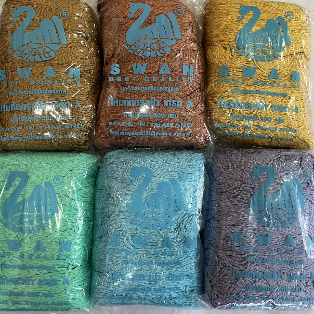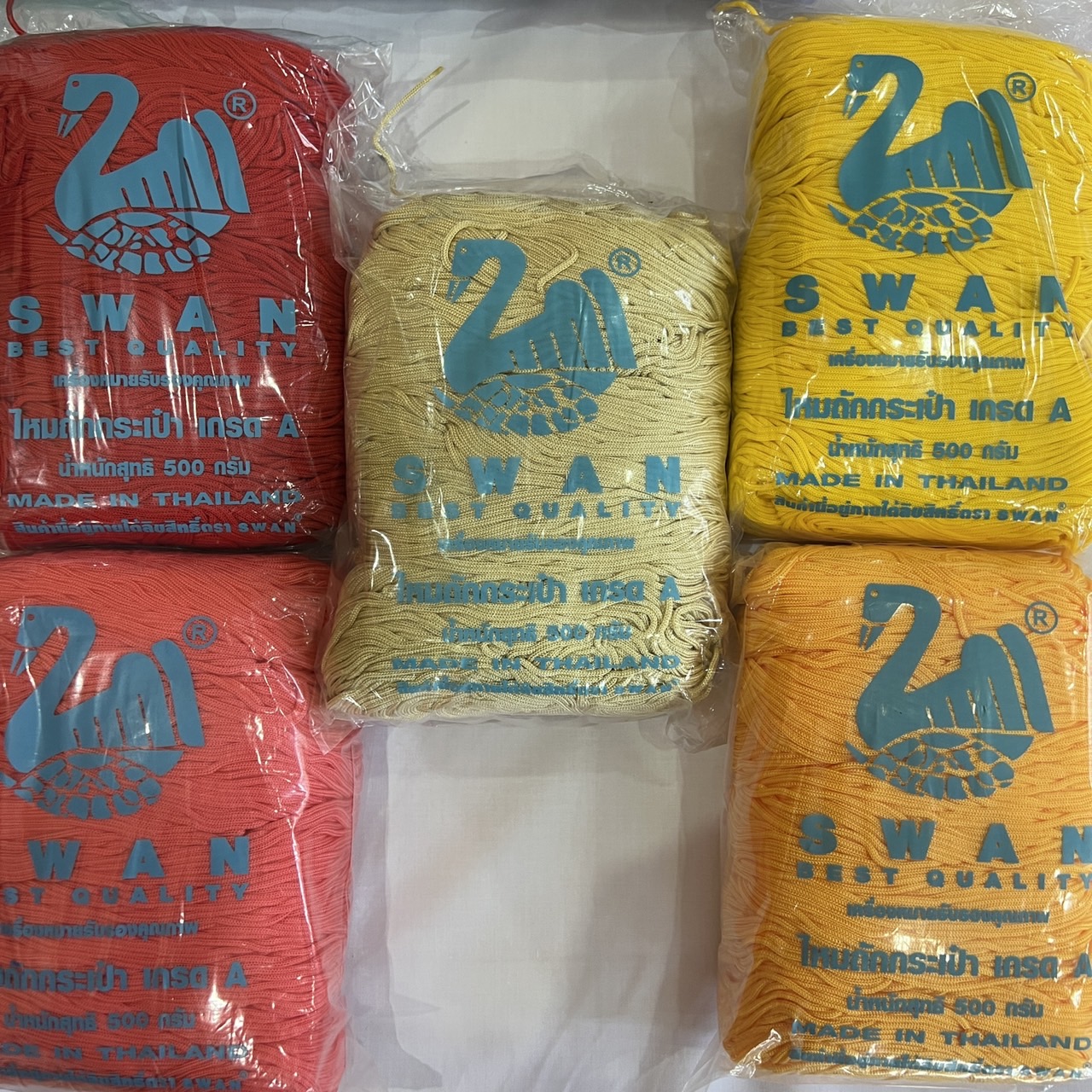 เชือกร่ม ไหมถักกระเป๋า ไหมถักโครเชต์ A ตราหงส์ (SWAN) ไหมญี่ปุ่นคุณภาพสูง เส้นนิ่มถักง่าย ถักเร็ว สีสวยทน สดไม่ตก มีสีให้เลือกมากมาย ทำจากเส้นใยสั่งเคราะห์ สามารถนำไปใช้ถักกระเป่า ถักเสื้อ ใช้เป็นเชือก DIY ใช้เป็นเชือกเอนกประสงค์ สามารถนำไปใช้ทำสร้อยคอ หรือเครื่องประดับต่าง