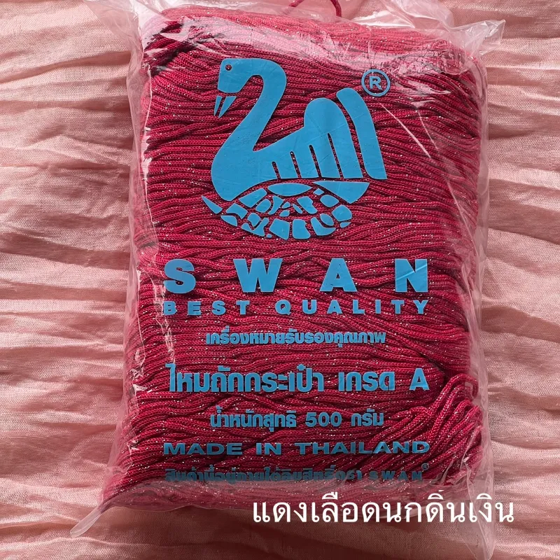 ไหมถักกระเป๋า หรือเชือกร่มถักตราหงส์ แบบดิ้นเงินสีแดงเลือดนก เหลือบเงิน เส้นไหมผสมเกร็ดเงิน ทำให้สีไหมมีความแวววาวสะดุดตาเพิ่มความสวยงามให้กับกระเป๋าหรือหมวกที่ถัก