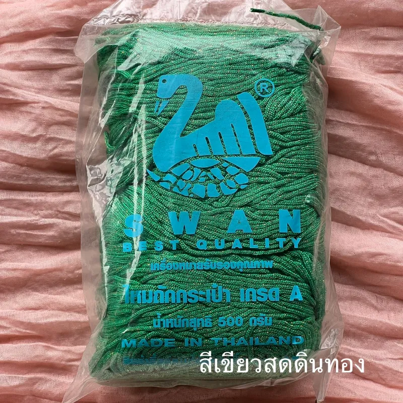 ไหมถักกระเป๋า หรือเชือกร่มถักตราหงส์ แบบดิ้นทองสีเขียวสด เหลือบทอง เส้นไหมผสมเกร็ดทอง ทำให้สีไหมมีความแวววาวสะดุดตาเพิ่มความสวยงามให้กับกระเป๋าหรือหมวกที่ถัก น้ำหนัก 500 กรัม เส้นผ่านศูยน์กลาง 2 มิลลิเมตร สีสวยสด
