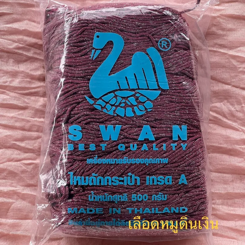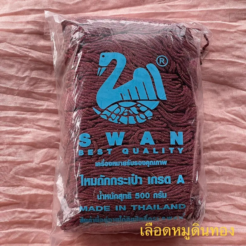ไหมถักกระเป๋า หรือเชือกร่มถักตราหงส์ แบบดิ้นทองสีแดงเลือดหมู เหลือบทอง เส้นไหมผสมเกร็ดทอง ทำให้สีไหมมีความแวววาวสะดุดตาเพิ่มความสวยงามให้กับกระเป๋าหรือหมวกที่ถัก น้ำหนัก 500 กรัม เส้นผ่านศูยน์กลาง 2 มิลลิเมตร สีสวยสด