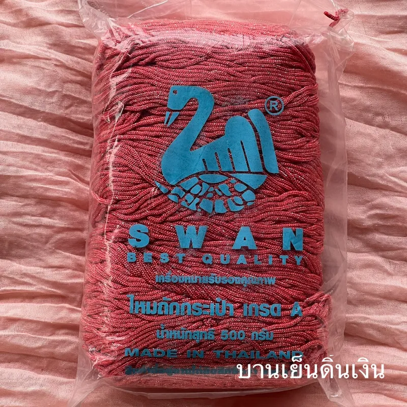 ไหมถักกระเป๋า หรือเชือกร่มถักตราหงส์ แบบดิ้นเงินสีบานเย็น เหลือบเงิน เส้นไหมผสมเกร็ดเงิน ทำให้สีไหมมีความแวววาวสะดุดตาเพิ่มความสวยงามให้กับกระเป๋าหรือหมวกที่ถัก