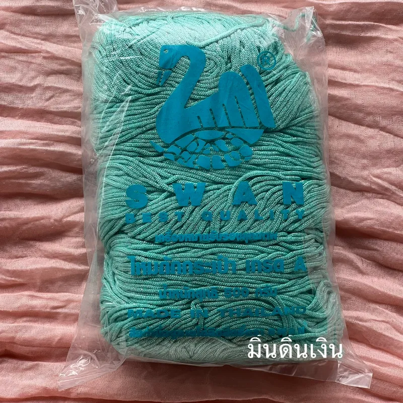 ไหมถักกระเป๋า หรือเชือกร่มถักตราหงส์ แบบดิ้นเงินสีมิ้น เหลือบเงิน เส้นไหมผสมเกร็ดเงิน ทำให้สีไหมมีความแวววาวสะดุดตาเพิ่มความสวยงามให้กับกระเป๋าหรือหมวกที่ถัก