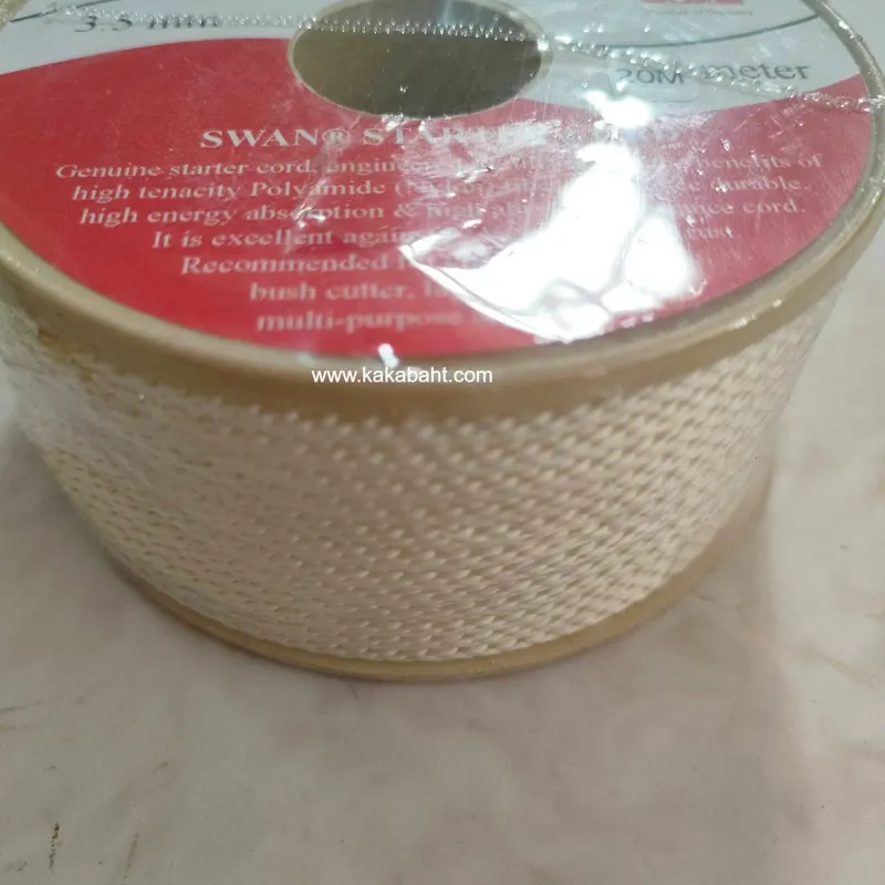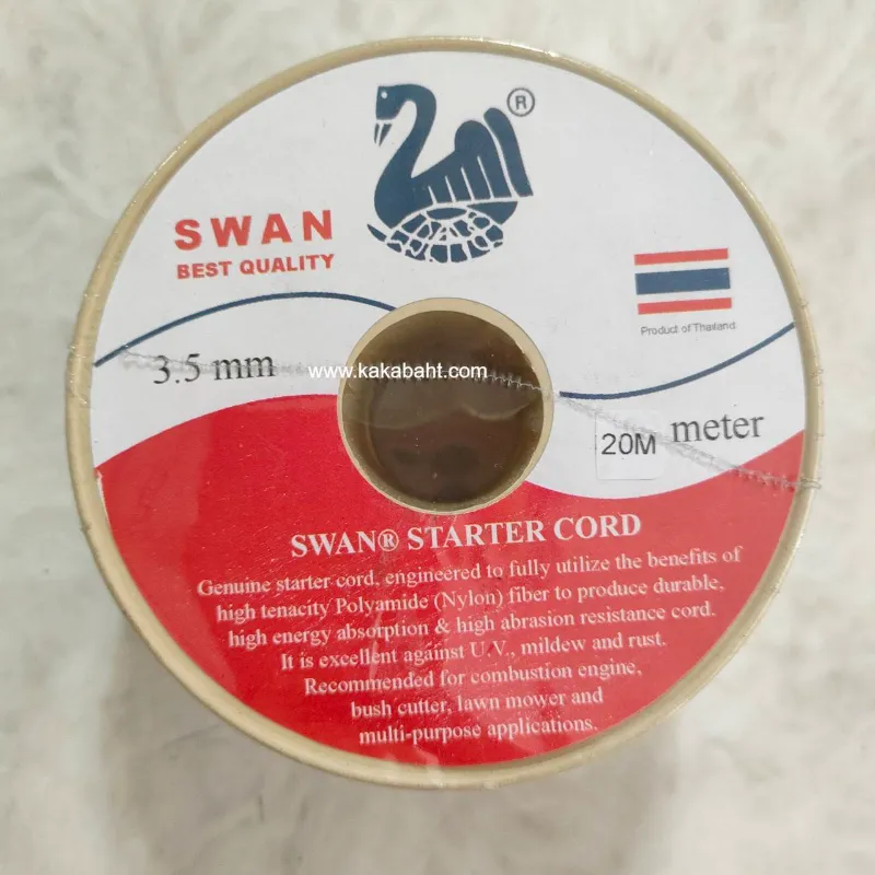 เชือกสตาร์ทตราสวอน (SWAN) ของแท้ ผลิตจากเส้นใยโพลีเอไมด์ (ไนล่อน) ที่มีความทนทานสูง สีขาวขนาด 3.5 มิลลิเมตร ยาว 20 เมตร ใช้สำหรับงานสตาร์ทเครื่องยนต์ต่างๆ เชือกลูกรอก สตาร์เครื่องตัดหญ้า ใช้เป็นเชือกอเนกประสงค์